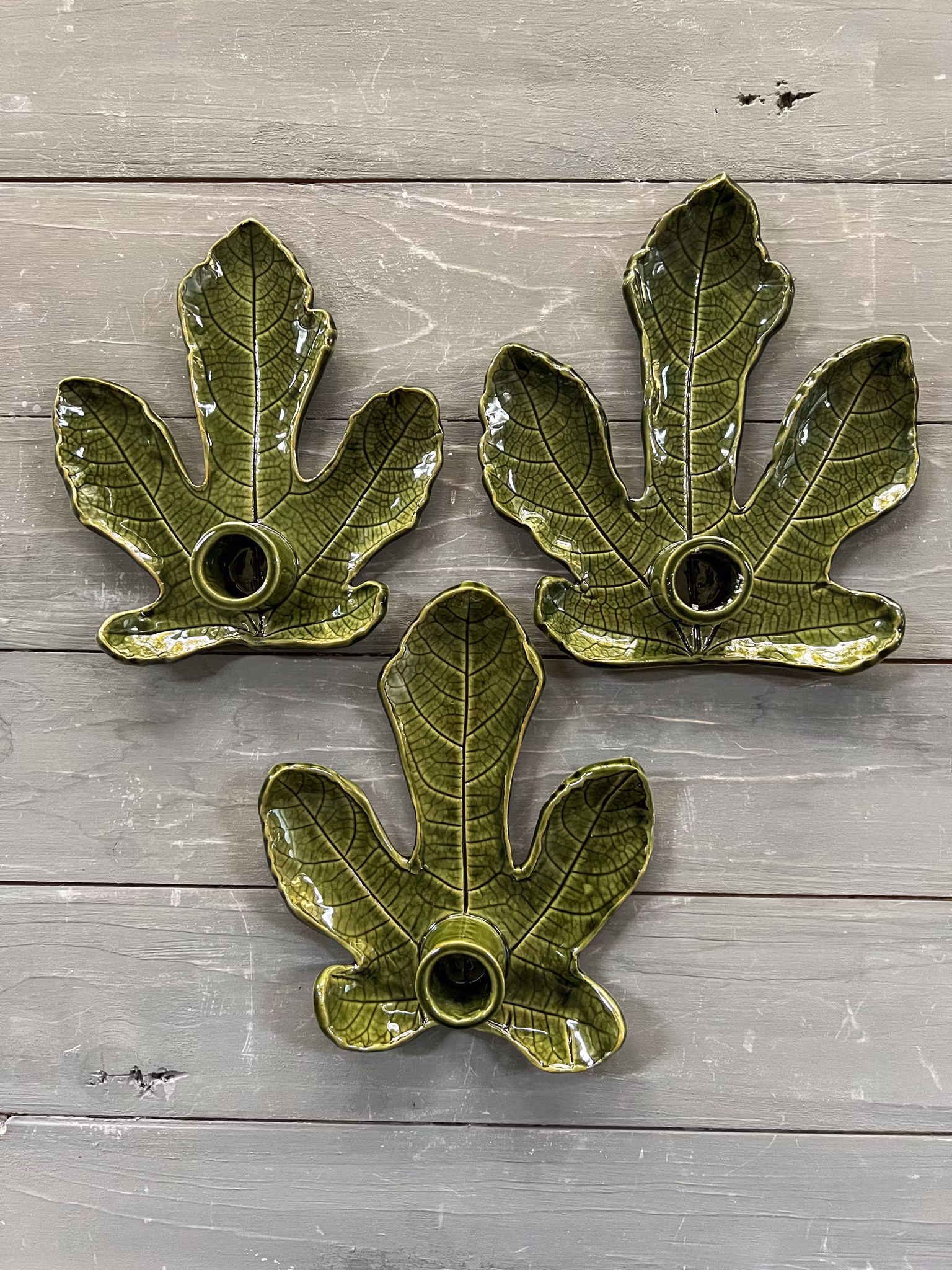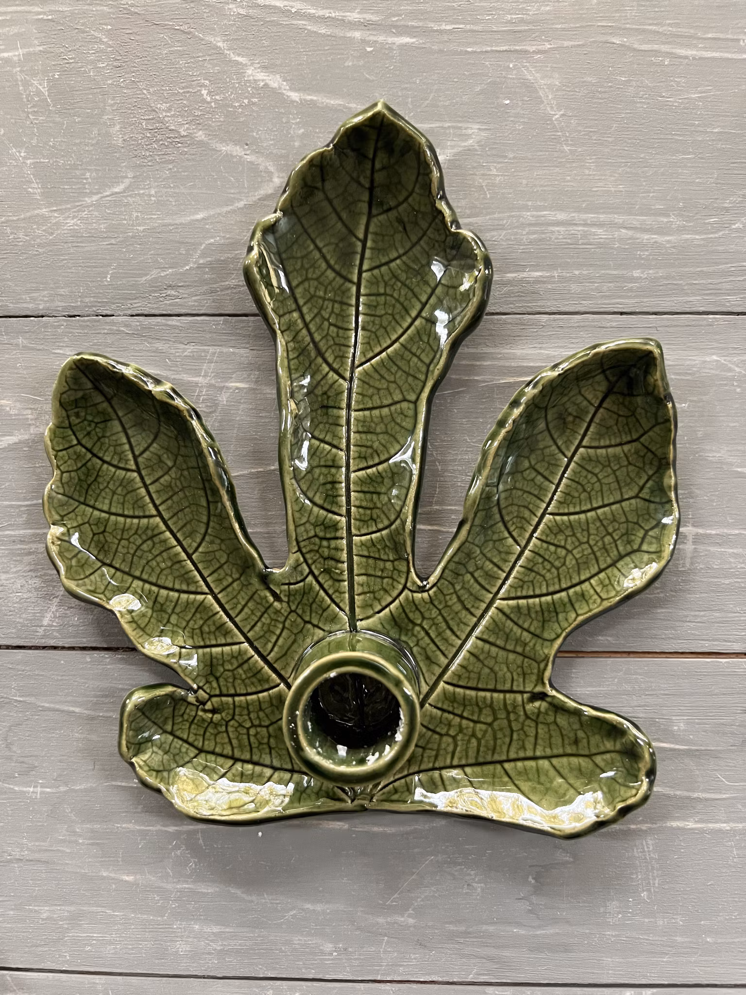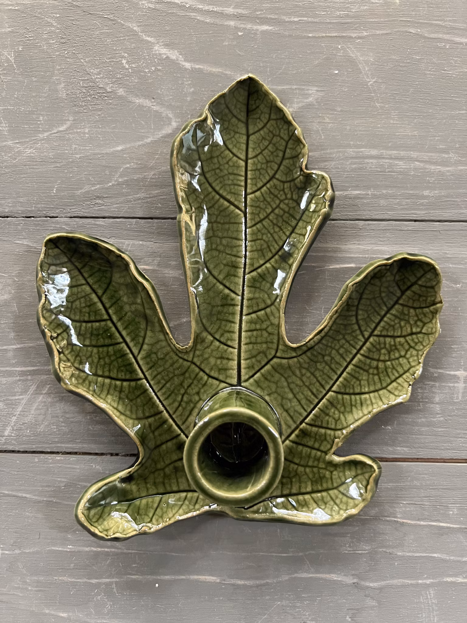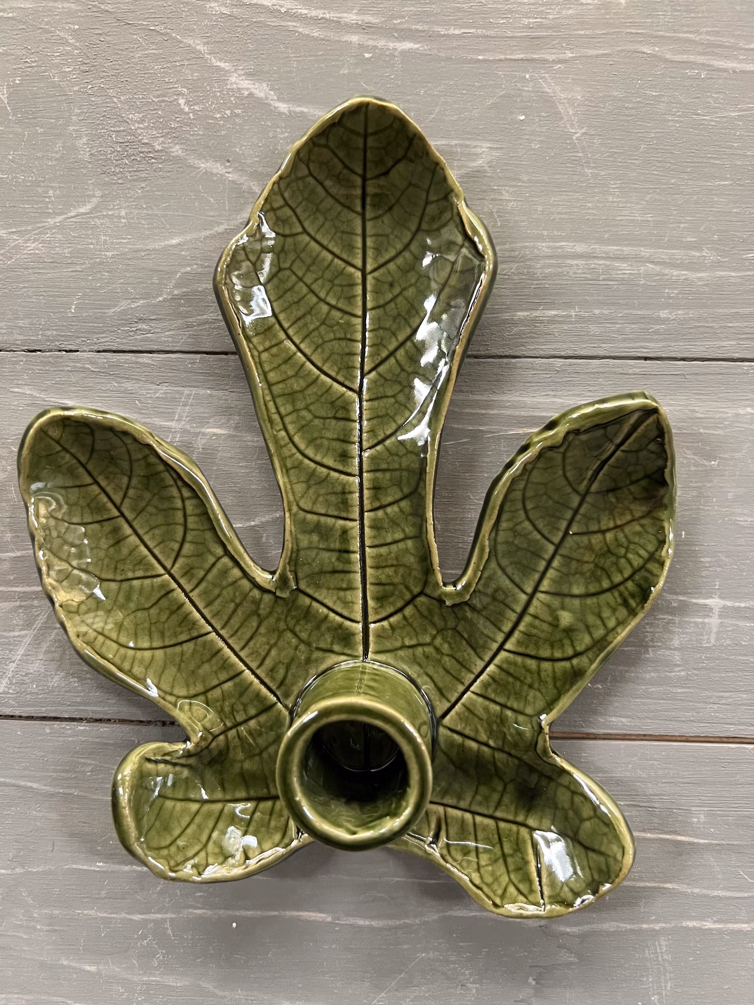 En ljusstake där leran har kavlats på ett fikonblad och formats av just det bladet. Det betyder att varje ljusstake är unik och liknar ingen annan.
