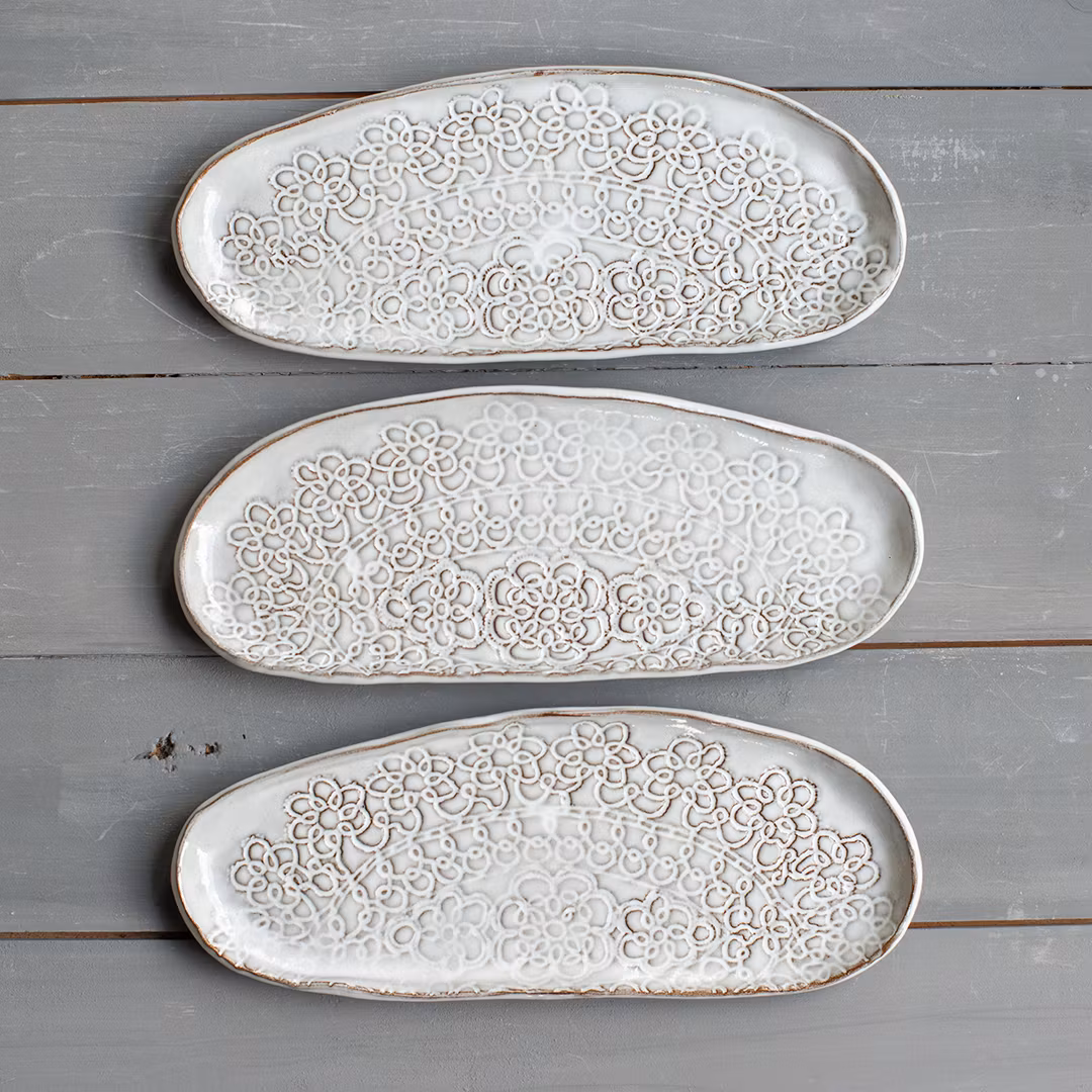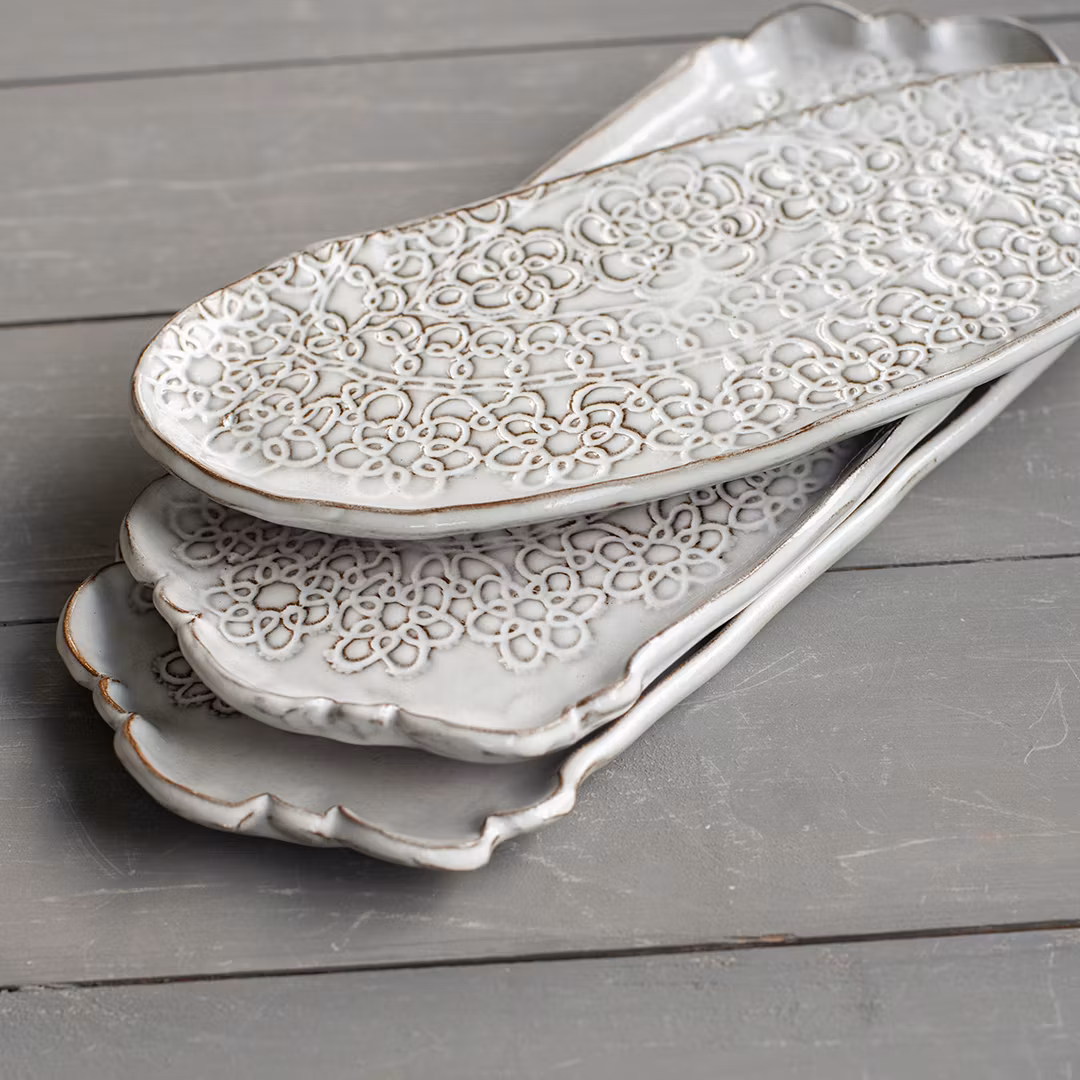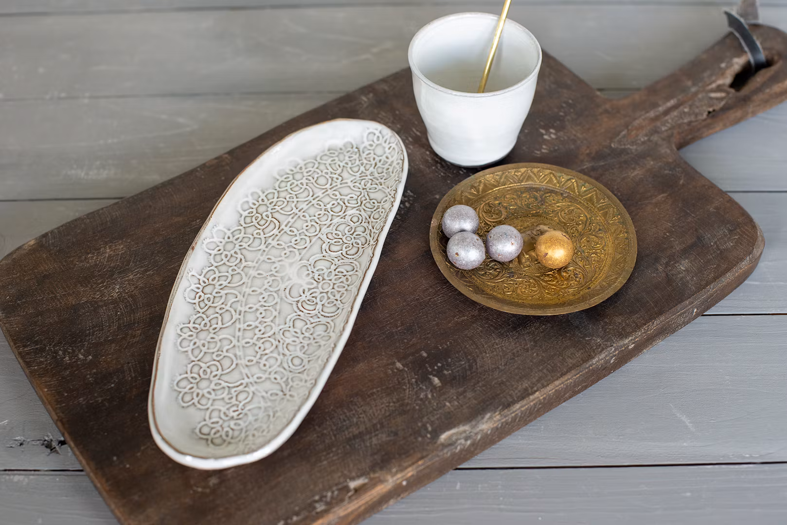 Ovalt fat med duktryck I lager. 170 kr Lägg i korgen Här har vi ett kavlat fat med lätt uppböjd kant. En virkad duk har gjort sitt avtryck i leran och fatet är glaserat med en vit glasyr. Mått: ca 22 x 9 cmFatet tål maskindisk och microugn.